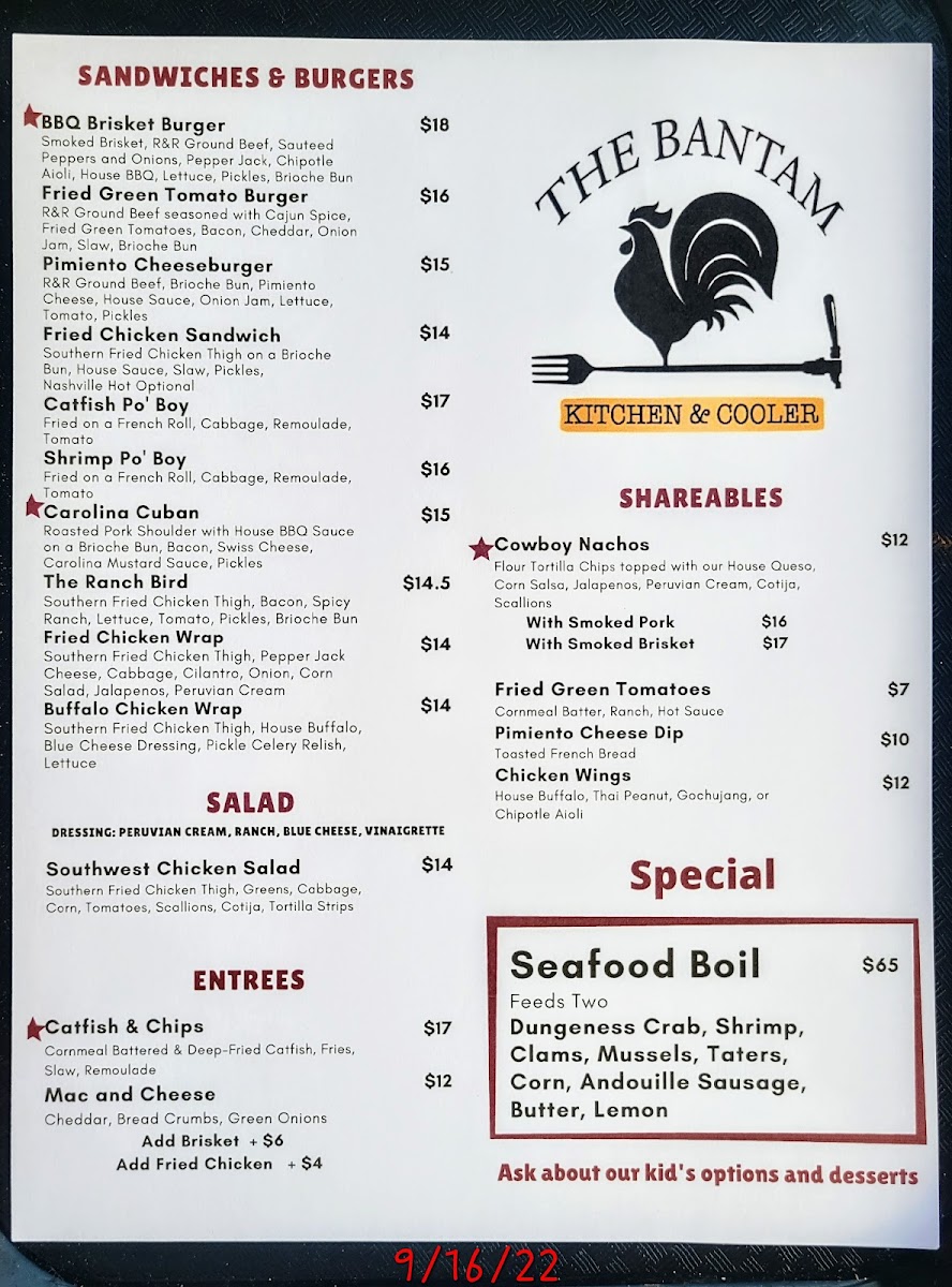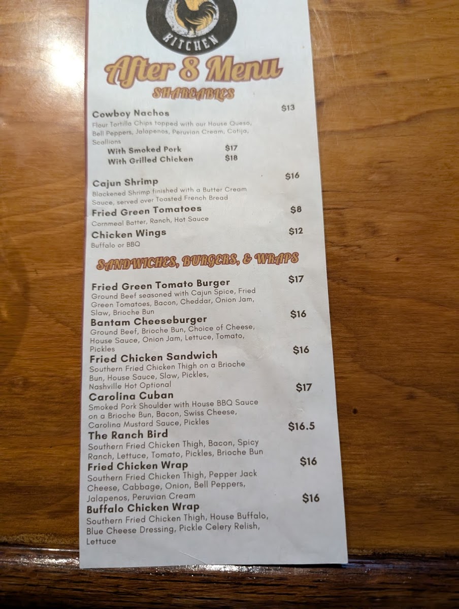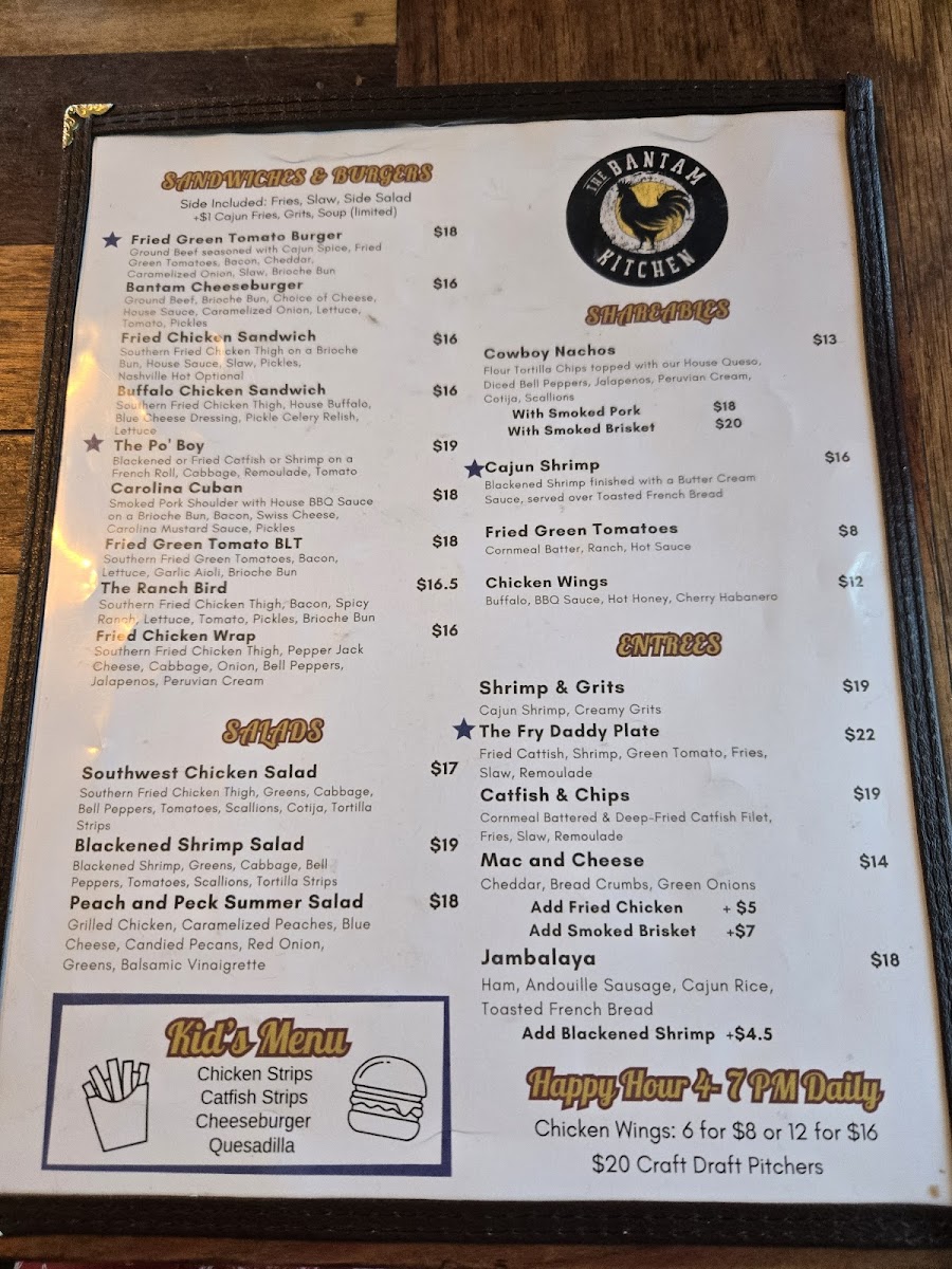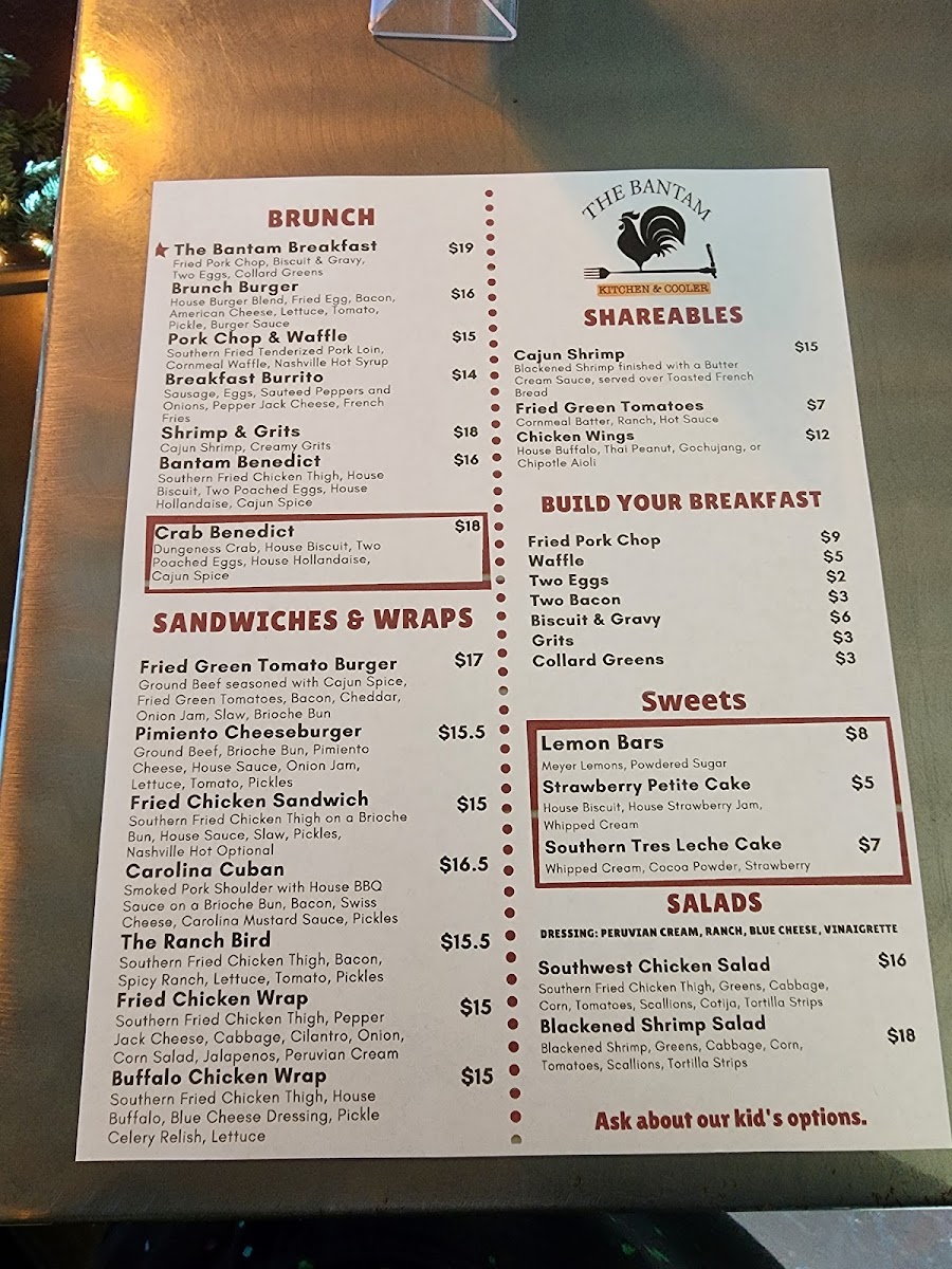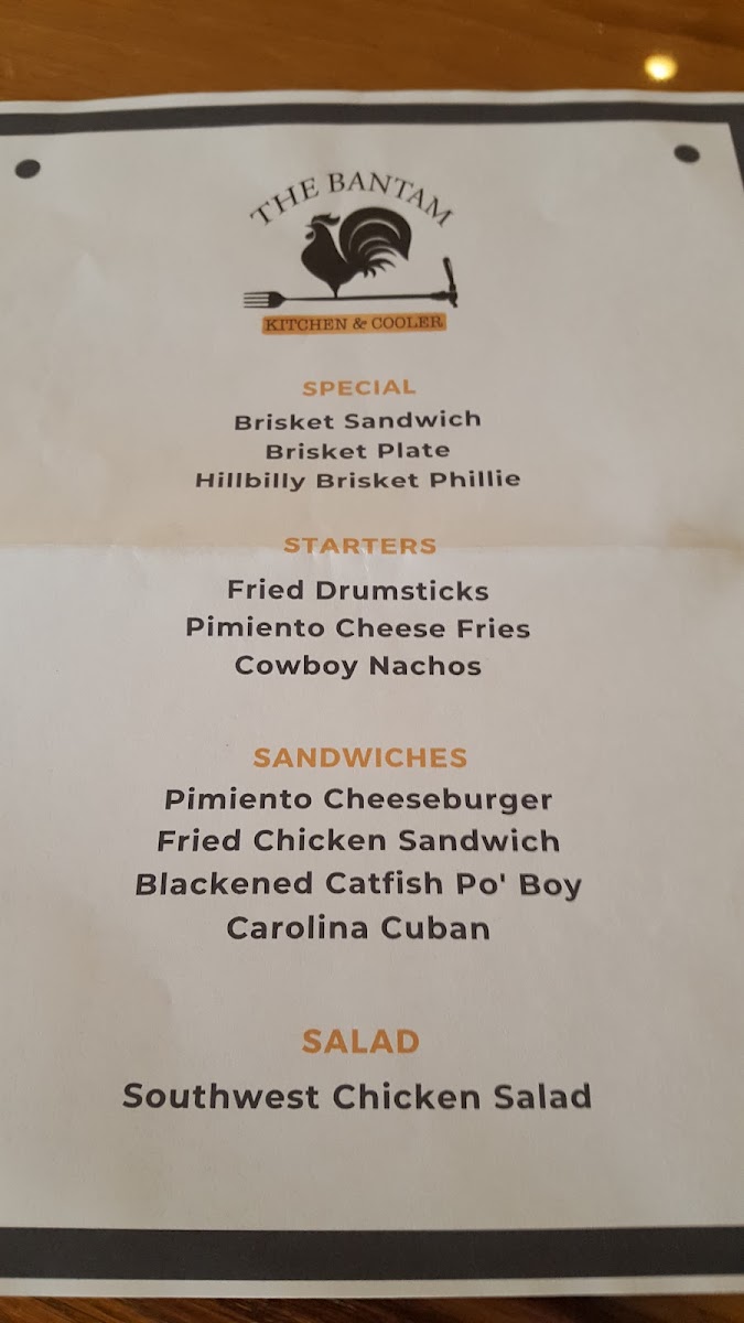Overall, The Bantam Kitchen's menu is a well-rounded mix of Southern classics and inventive twists, with something to satisfy every palate, from hearty comfort food to lighter, fresh options.