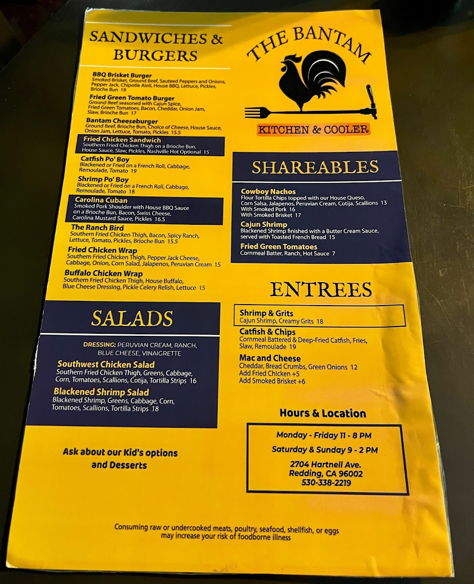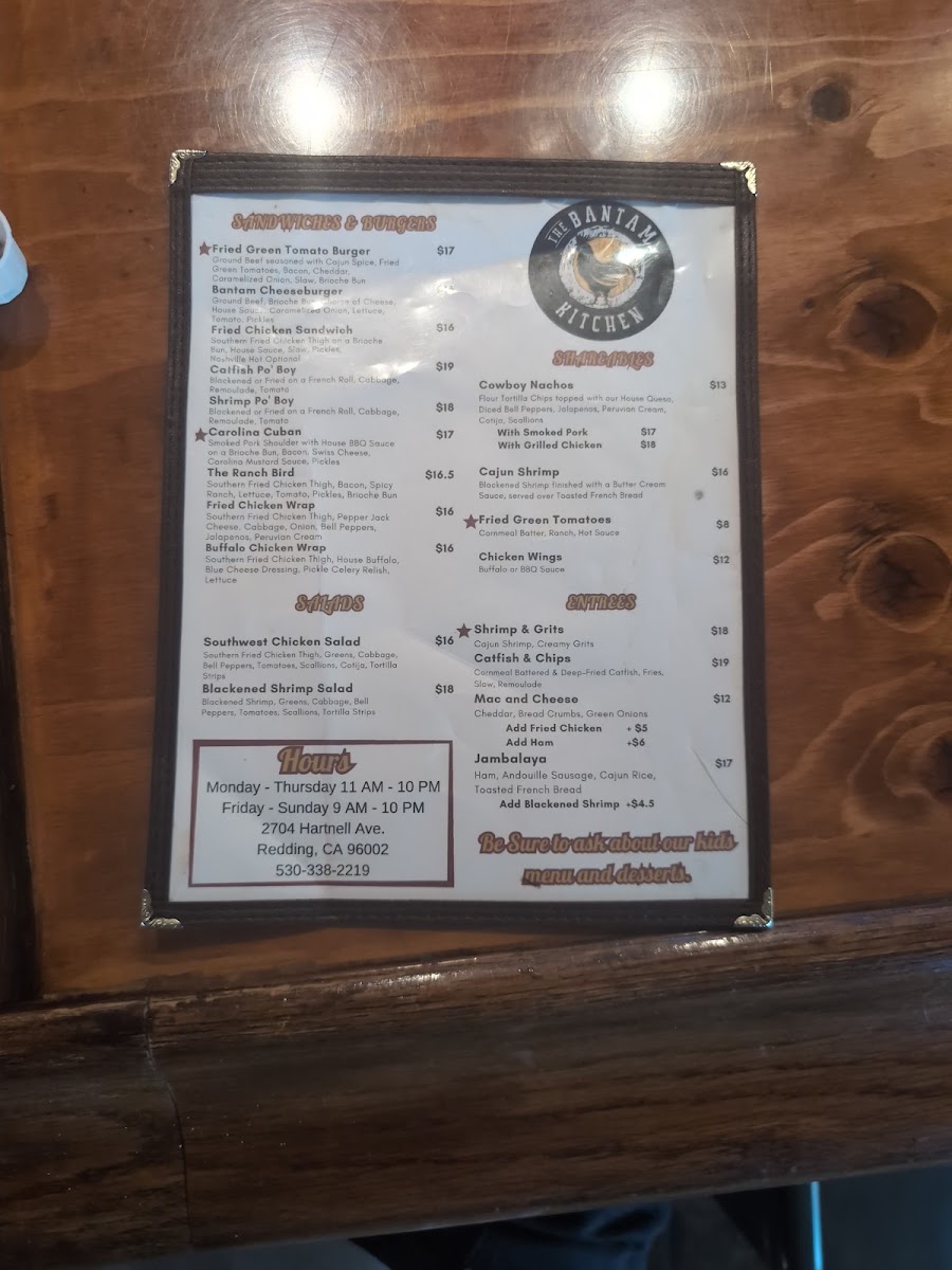 The menu at The Bantam Kitchen in Redding, CA, offers a delightful mix of Southern-inspired dishes with a unique twist. Their Shareables section is a great start for those looking to enjoy a variety of flavors with friends or family. The Cowboy Nachos is a standout with its hearty portion and bold flavors. For a spicier option, the Cajun Shrimp delivers a perfect blend of heat and seasoning, while the crispy Fried Green Tomatoes provide a deliciously tangy contrast. The Chicken Wings are another must-try, offering a satisfying crunch and smoky flavor.